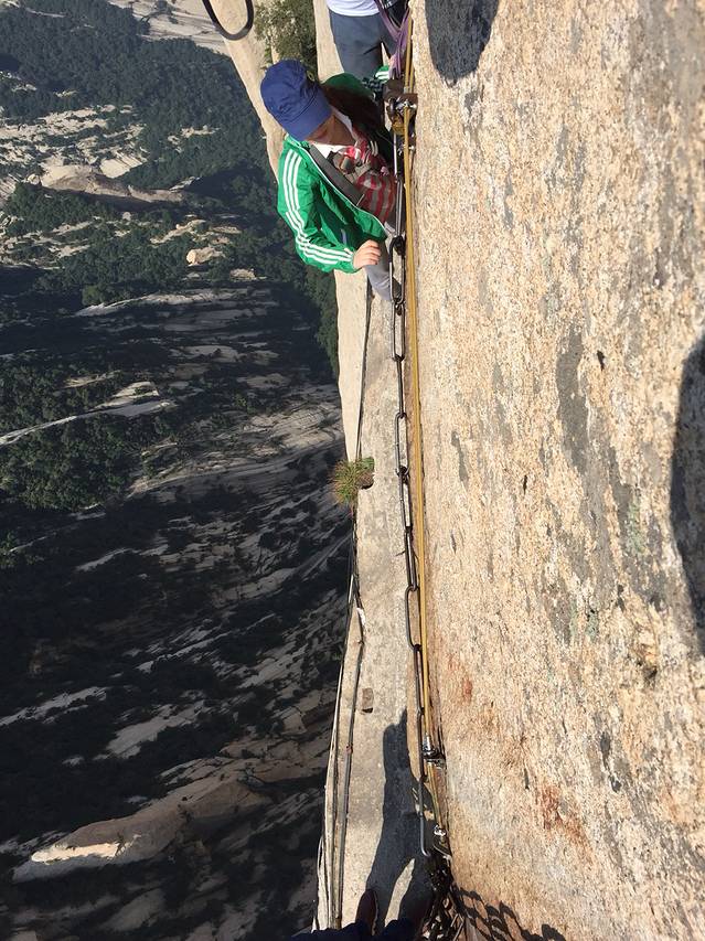 接着我们又前往南峰长空栈道,人好多(保险带30元每人)排了一个多小时才轮到我们,长空栈道是在一段20米长的台阶下面,下台阶也是垂直的,长空栈道大约30米,很好玩,脚下就是万丈深渊。贾平凹在《商州》里面曾写到,主人公在华山脚下捞尸体,摔下华山的人家属都会找人找到亲人尸体然后背上山,一次500元,好恐怖~