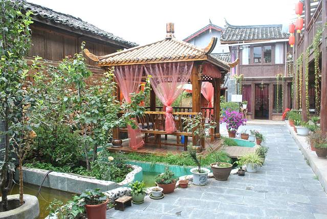 经过一个小时的车程和几分钟小路,约上午11点左右,我们到达的花水木精品客栈。客栈给我们的第一感觉就是精致,有一个不小的庭园,园的布置十分用心,园中间有个亭子可以大家坐一坐,发发呆。经过简单的资料登记后,店员告诉我们已经可以入住了,这令我们十分惊喜,顿时对这家客栈的第一印象提高了不少。放下行李,我们就到附近的丽苏綠吃午饭,点了当地特色的腊排骨和纳西炒饭,味道还不错。