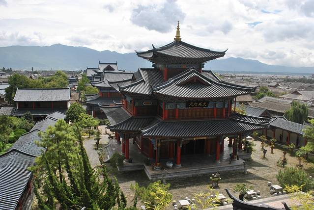 大研古城给我们第一印象就是太商业化了,路的两边全是商铺,格局基本跟束河是差不多的,但没有束河的小清新,因为游客实在太多了。到了大研,主要是观光景点就是木府了,我们提前一天就是去哪儿订了木府的门票,到大研四方街找一个小哥换个电子票就可以进府了。木府配有免费的讲解(其实是费用已含在票价里),跟着讲解的妹子一边听一边看,一个小时左右就游览完毕了,总的感觉还是不错的,值得一游。据说木府后面的狮子山可以俯览整个丽江古城,但去到木府后山的一个道观上已基本可以看到了,所以我们没去狮子山,从原路返回木府正门出去。