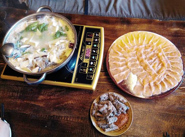 晚饭我们在酒吧街找一家吃三文鱼的点了个三文鱼三吃,味道果然不错,主要是鱼是现杀的,非常新鲜,鱼头汤鲜味十足,老婆最是喜欢了。