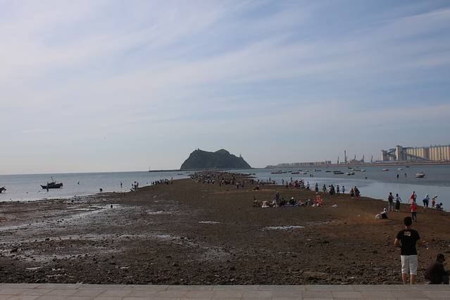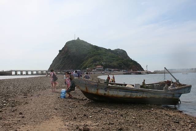 在站前乘坐班车就可到达笔架山,我原来一位虎跃直客是直达,十元一位,出来玩也不差钱。没想到也是中间停很多站,最可气的是在虎跃先出发的,最后被城际超车了,城际也是软座,虎跃就多个空调,没有一点用,票价差了两倍。门票每人70元,学生证半价,游船每人单程15元,这个没有必要涨价,因为司机到岸是都要交钱的,归景区管理早晨去的时候我是走的天桥。经过了大约一个小时,终于到了笔架山景区,老远就能看见笔架山。一下车就有卖网兜的,一元两个,一群老太太忽悠你买,一毛钱都不要买,根本没有用。买个铲子还可以,另外拖鞋不用着急买,到了有水的地方自然有卖拖鞋的。售票处在广场的左侧,入口在右侧,所以不要看着入口就冲过去,否则要走很多冤枉路。票很特别,字明信片的样子,比起其他景区的我更喜欢这里票。去的时候天桥刚刚出现,很开心,去之前一定看好什么涨潮落潮,至少走一趟天桥,虽然游船并不是太贵,但毕竟天桥是特色嘛!桥上面都是大石头,走起来很硌脚,感觉很失望,不过在桥上有很多小水坑,这里面有很多的鱼和寄居蟹,可以翻开石头抓几只,不过一定要放生,根本养不活。走了很远才到山下,而且中间有个地方还要淌水,必须得有拖鞋,拖鞋如果不带在淌水的地方买就行,洞洞鞋才15元,男士的20元,市场上也就这个价,很划算。上了岛,在那不要吃海鲜,if你是土豪。上了岛就开始爬上了,道路几乎都是蜿蜒的,真的很累,沿途有很多的小景点。烤肠很贵,还不好吃,建议带一点吃的,不过记得保护卫生。不恐高一定要登上岛上的三清阁,真的很高,我爬了一层就下去了,好怕怕!!!在这里还能看清锦州港的全貌。没有什么值得纪念的纪念品。从岛上下来,天桥已经被淹没了,坐船回去!