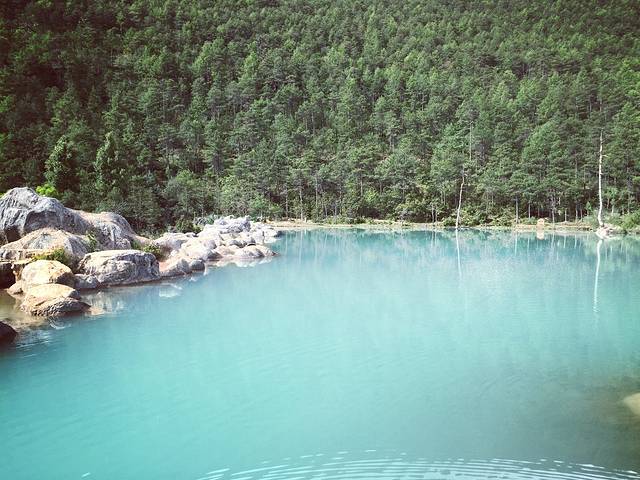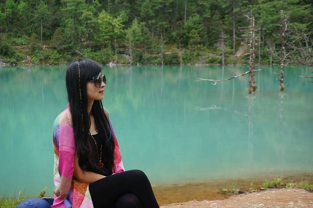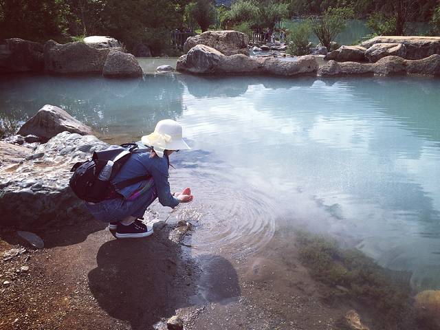 去雪山之前,为了等缆车安排时间(建议去雪山还是跟团,因为自己买票排队缆车,非常耗时),导游让我们先去逛蓝月谷,无比英明的导游啊,别的团都是游完雪山再去蓝月谷的,最后根本没心情玩,雪山下来再加高原反应,哪里有心情和体力玩。蓝月谷号称小九寨沟,真的是不虚此名,蓝绿色的湖面印着雪山和白云,静静的就在你面前展开,如果不是赶时间,可以慢慢的游一天。我们因为只有一个半小时的时间,所以就拼命拍照了,没有好好感受这里的好风景。不过我还是在蓝月谷洗了下手,水很凉很轻透,哈哈。