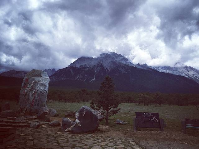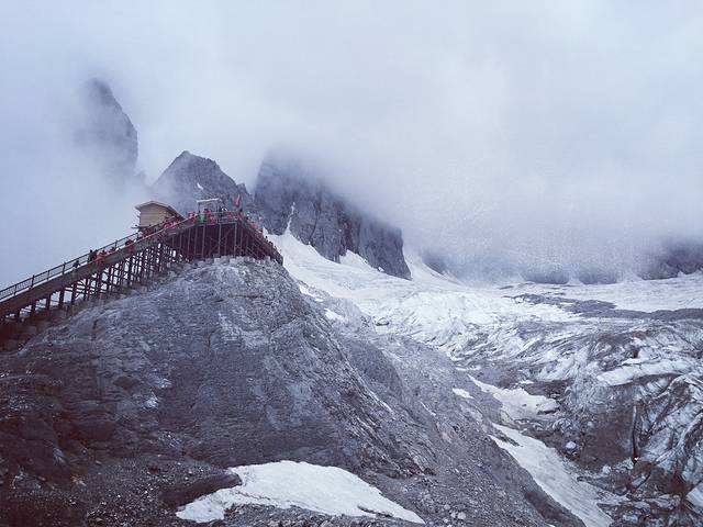 重点戏在后头。这次最值得的行程,就是玉龙雪山了,在车上听导游讲,当地纳西族把玉龙雪山尊为战神,非常崇敬神圣,因此雪山至今为止没有一个登山队登顶,因为战神是不能被踩在头上的。当然科学一点的说法是,雪山山顶结构都是火山灰,登山工具都用不上,这个说法比较可靠点。故事说完我们就到了坐缆车登山的地方,3000多米,我居然已经开始头晕了。心里非常忐忑,难道真的会高原反应,问闺蜜,说没反应,好吧,我跑去买了骨肉相连和地瓜,就算晕倒也要吃饱,吃货的人生啊。话说那骨肉相连真的太好吃了。路上一直念念不忘。导致我到雪山上面神马都吃不下,因为都是甜的。什么巧克力,红牛都变浮云。还好也不饿。