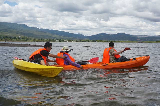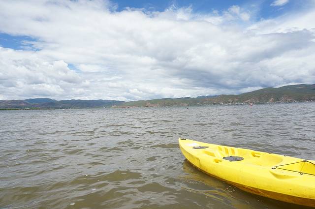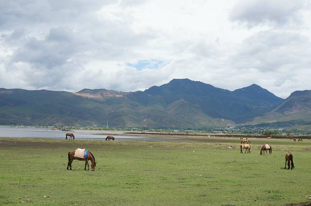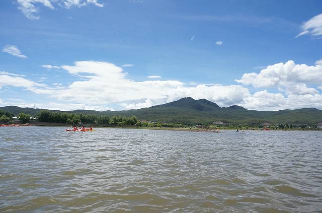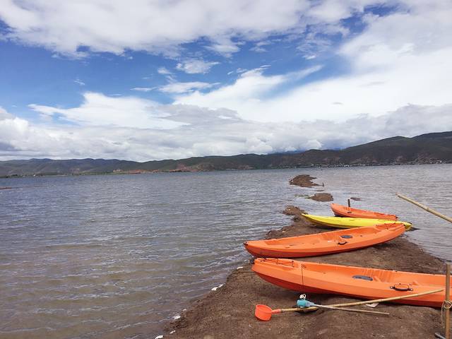第二天定的是11点出发,所以我们一直睡到8点多才起床,不用赶时间真舒服。我们慢悠悠的起床收拾,再去吃早餐,鸡肉米线。有点油腻,不过米线挺好吃。吃完回到客栈跟老板聊天了一会儿,才出发去拉市海。小面包车,7个人一车,出发拉,路上小哥放着凤凰传奇的歌,听的心情舒畅。咋知道我喜欢凤凰传奇呢,给个赞。丽江古城到拉市海只有半个小时,我们很快就到了马场,结果说没马,让我们先去划船,也好,反正就是放松游。到了划船的地方,我又有点亢奋。遥远的天边,有着马群,草地,湖水,白云,多么美的一慕,都不忍心走进去。划船的人不多,其他的年轻人都选择了皮划艇和竹排,我还是热衷小铁皮船,带着怀旧的心来的。所以我们两个做着铁皮船慢悠悠的看着风景,船夫在后面慢慢的撑船。感受了许仙和白娘子的心情。哈哈。一路边拍边走,那些皮划艇最后都划不动,靠着我们小船休息了,还好我们没划,衣服裤子都会湿掉。那些学生也很兴奋,一直唱着歌,让我们荡起双桨,小船儿推开波浪。。。。。。