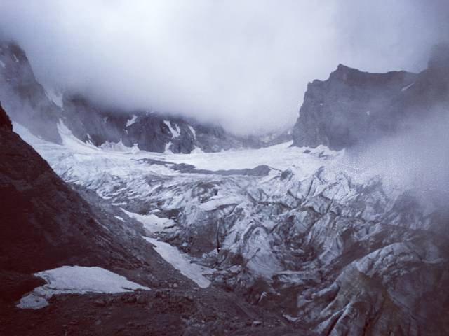 越往上,风景越特别,冰川与火山灰融合,高远的天空及雾气笼罩的这一切,我们在感叹大自然的造物神奇之时,一个小坡上去,我们都惊呼了。非常壮观的大冰川。积雪在山脉上形成了自然的骨骼地貌,层层叠叠,非常壮观。照片永远排不出现场的感受和神奇的实景。只有亲临那刻,才会对大自然心生敬畏。心仿佛被洗净了,呆呆的看着,感受着。一切悲欢离合在那里都显得云淡风轻。雪山能带走你的悲伤和喜乐,让你宽容和敬畏。