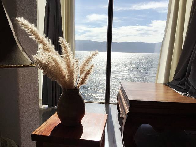 这辈子,每个人都应该有一次,跟着闺蜜,来一次说走就走的旅行,从决定出发,到上飞机到彩云之南,只有一周的时间。不想走的理由有千万种,想去的理由只有一个。大理在呼唤我。路途非常折腾,从晋江坐飞机到昆明,再从昆明打的到客运西站,中间还被的士要挟,中途报警才解决了,云南的警察还是很负责任的。等我们从客运站坐了5个多小时的大巴到大理的时候,天已经黑了,风很大,让我们从32度的天气直接转到19度,都有点不适应,客栈的老板叫了的士来接我们,到客栈的时候已经是晚上11:30分了,因为定的是超级海景房,都有点遗憾,这么晚才到,没有见到想要的落日,而且当天晚上变天了,也没看到星空,当客栈老板带我们走进房间,装修风格一看就是我喜欢的,菩提风,素雅,精致,所有的洗漱用品都像家里一样,都是品牌的。还很贴心的准备了护发素。当老板走的时候,我打开房间的落地窗,惊呆了,夜晚的大海很宽旷,海浪声很大,甚至有点让人害怕,感觉自己就像在甲板上过夜。