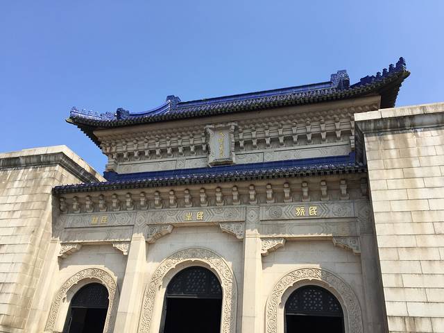 到达中山陵,参观博爱坊、陵门、碑亭、祭堂、墓室。中山陵以“孝色”中的蓝色和白色为主要基调,给人感觉肃穆但不压抑。(唯一遗憾的是墓室没有开放)