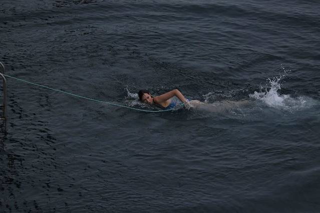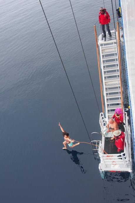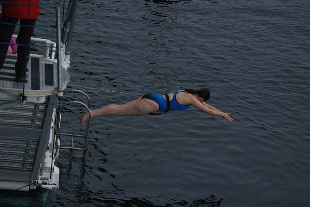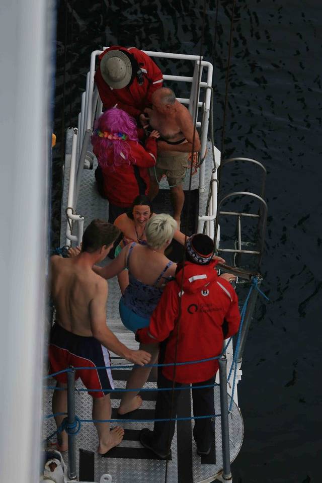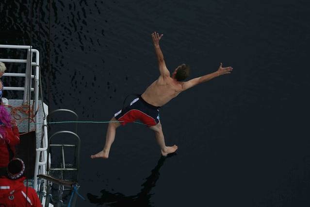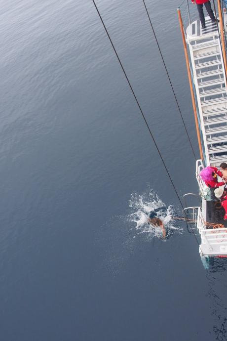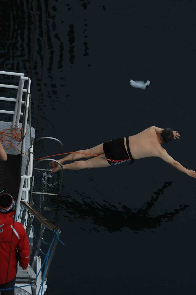 南极跳是考验人们胆量和意志的项目,我原本跃跃欲试想加入,但被同行驴友劝阻了。“毕竟是寒冷的天气,冰凉的海水,别因为这一冲动落下身体的疾病”。听人劝,只好作罢。但没料到,参加的人那么踊跃,白发苍苍的老妇人,头发稀疏的老先生,他们都那么勇敢。唉!真有点后悔了。还好,我们同行的15人中有3人参与了,其中就有年龄最大曾做过心脏支架的二鸣大哥。