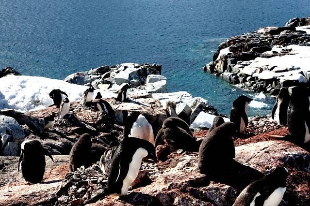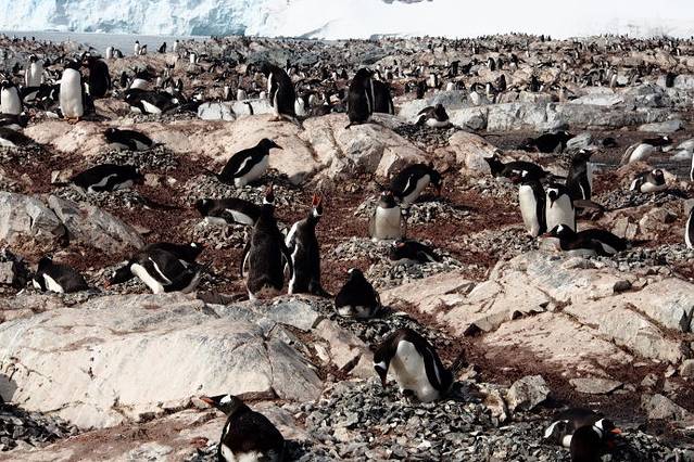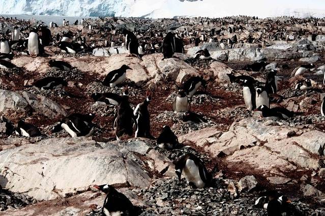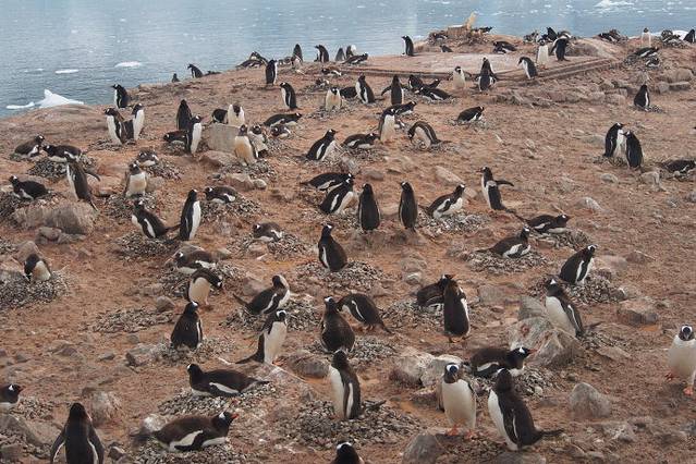 每年11月左右南极企鹅会筑起一个个由石头组成圆形的巢,每次孵约两只蛋,而孵蛋的工序则会由雄性和雌性轮流进行,为期5至10天。它们亦会在冰山上进行繁殖,但毕竟它们是比较喜欢在没有冰的环境下繁殖。幼企鹅会在约35天后孵出,初生时,其背部和腹部分别有灰色和白色的绒毛。幼企鹅在巢中多逗20至30天之后就会离巢。在出生后50至60天后,它们会换毛,换为成体的毛之后就可以出海。我们选择1月去南极就因为这时大多数的小企鹅刚刚孵出,是最佳的游览时间。登岛观看企鹅和坐船巡游观看造型各异的美丽冰峰和其它动物是我们每天的游览项目。尽管我对南极企鹅数量很多有所耳闻,但真的登岛实地观看,还是被漫岛遍野,密密麻麻的企鹅大军给震撼了。