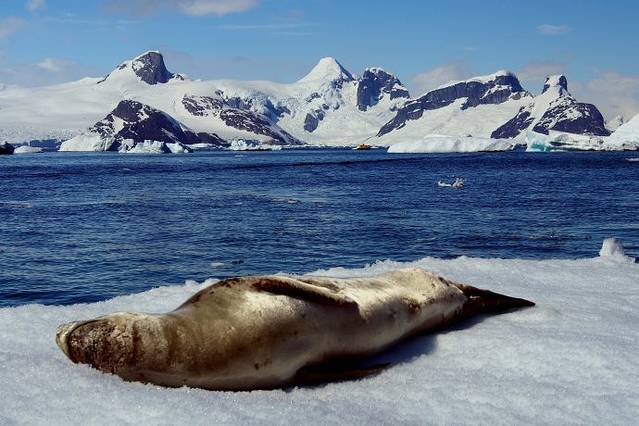 这是我们看到的第一只海豹——威德尔海豹,游客乘小艇围绕着冰块不停的拍摄。