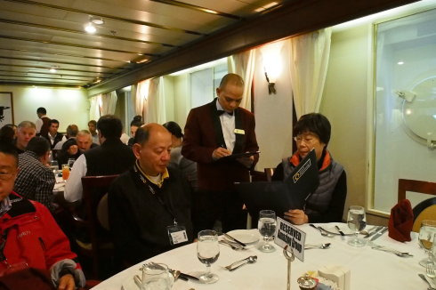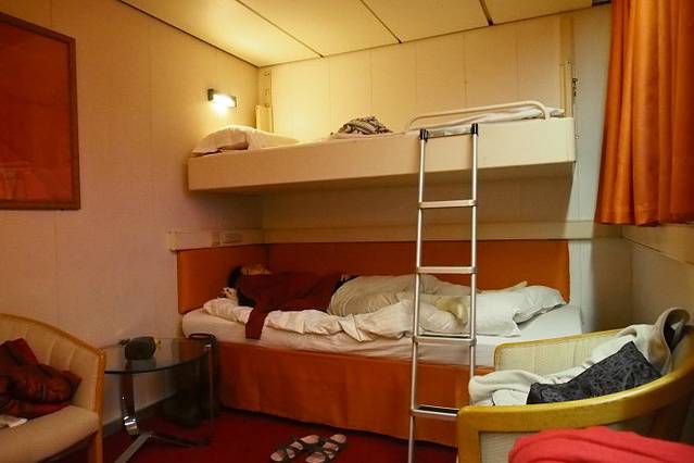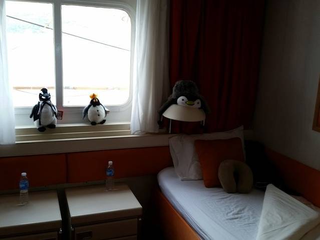 游轮驶离乌斯怀亚数小时后,就进入海峡,行驶二天才能穿过海峡进入南极半岛。为了预防晕船,游客们都到医务室领取了据说很有效的治晕船的药。晚餐后都老老实实地吃药,卧床,迎接风暴的考验。我相信自己的平衡能力,领了药但没吃。由于我们一行中出现单数,我主动提出可住3人舱并自告奋勇地选择了上铺。我们的运气还不错,没有遇到大的风暴,即使这样也有几位驴友卧床不起,不吃不喝,晕船反应很大。而我的感觉只是有一些眩晕,躺在床上还能平稳入睡。一日三餐一顿也没少。但以防万一,我还是没敢在船舱里随意走动。