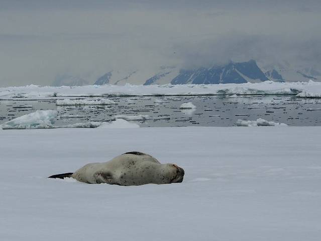 这只萌萌的海豹应该是豹形海豹吧,它嘴下面和冰上的一滩血迹可能是刚吃了一只企鹅吧。