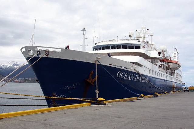 下午,我们终于要登船了。我们乘坐的钻石号游轮是所有南极探险游轮中体积最大,载客最多的。按南极保护公约规定,每只船的载客人数不能超过190人。我们游轮的床位是189个。