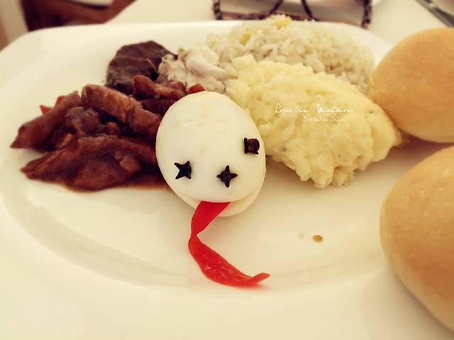 第一次去餐厅吃饭的时候要出示房卡,小黑会给我们安排固定的餐桌。