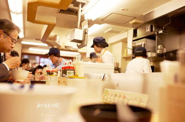 我点的是三种肉的套餐,炸猪排、牛肉和羊肉,再摊上一个鸡蛋+浇汁儿,味道非常不错,但就是特别咸。这时候我们才发现,原来这里的米饭是无限量供应的,再配上这么下饭,这么咸的菜,正好满足了一些大胃王的需求,估计这也是日本比较普通常见的快餐形式了,我自己感觉,可能类似国内的真功夫,嗯。。。另外必须再说一遍,日本的饭,量它真心是不小滴!