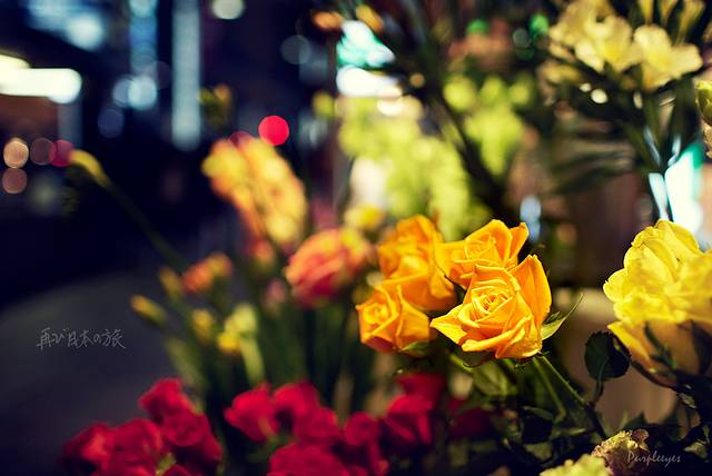 吃完和果子,银座这条街也逛了一大半了,今天我们没有进到各个百货大楼里去逛,只逛了街面儿上的店铺。转角处有一家花店,水灵灵滴花儿们趁着街灯,很温馨。