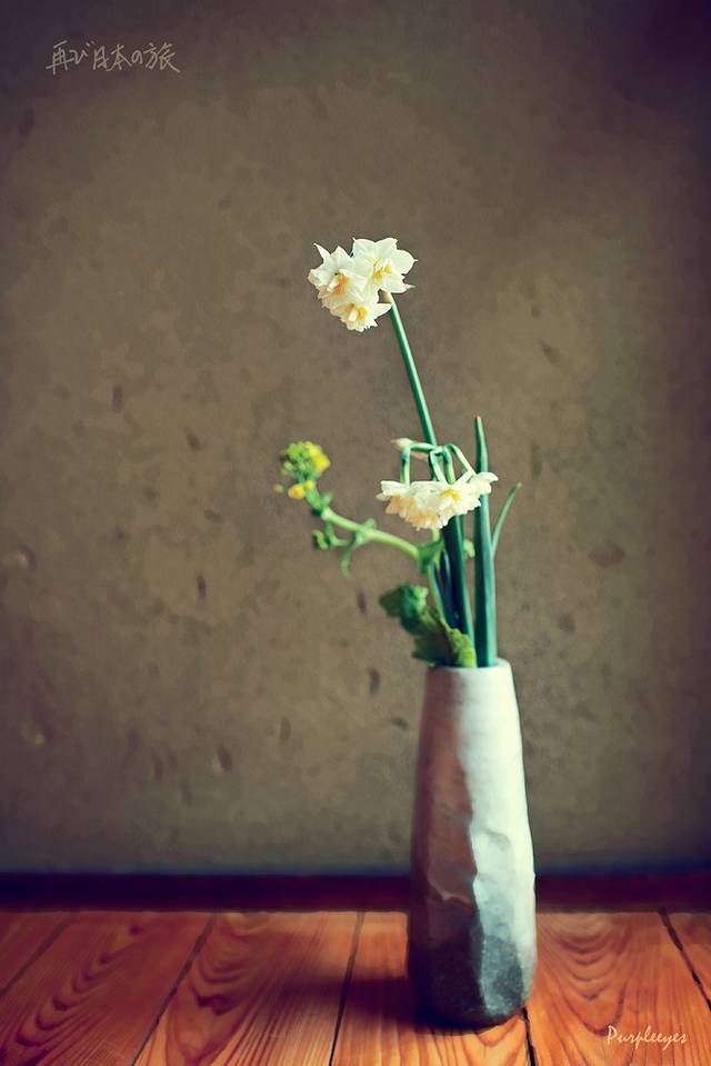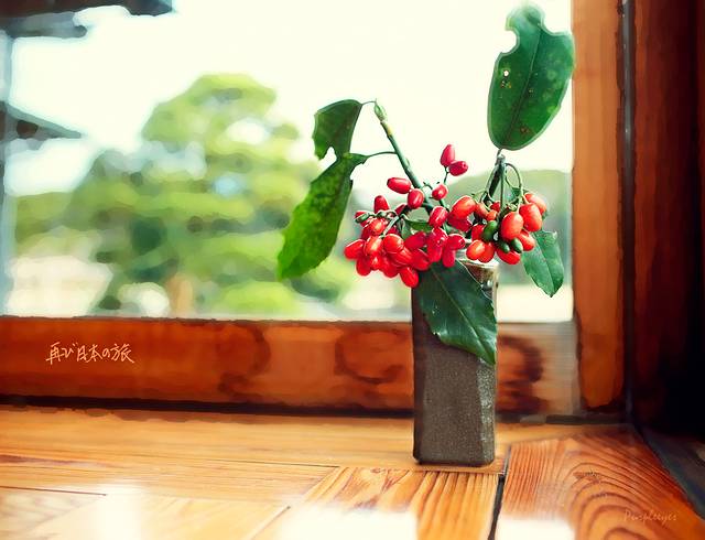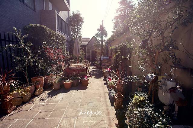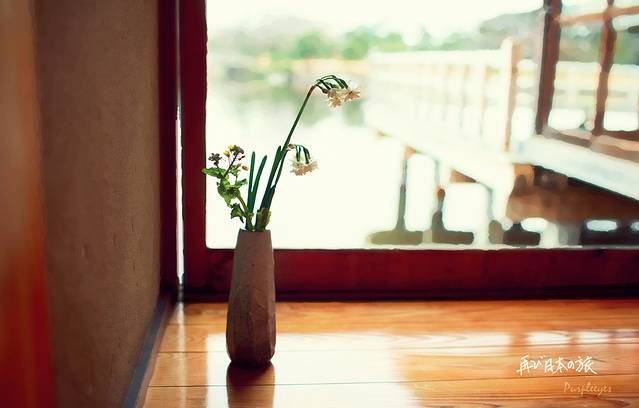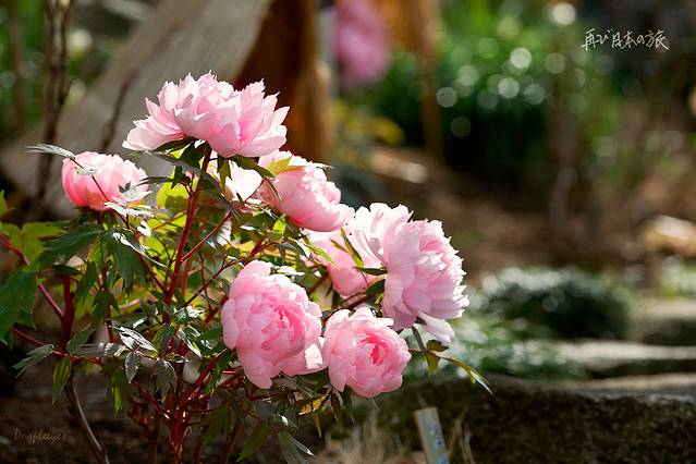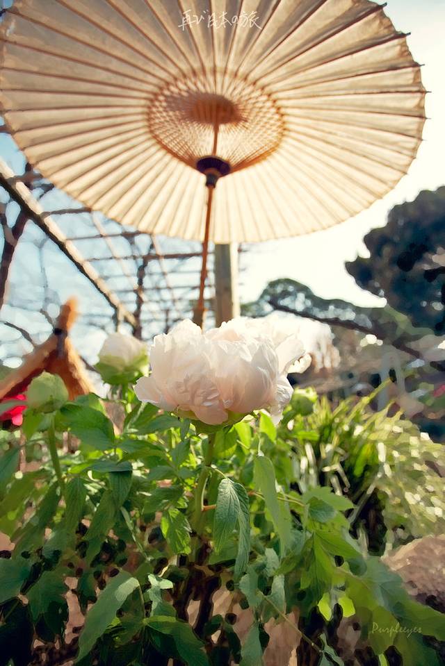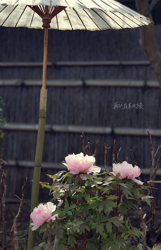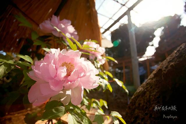 日本的花道真是处处有体现呢,比如说这个场景,我们可以发现,草棚、牡丹和周围的其他小花,甚至旁边的木牌、后面的篱笆都是有所呼应的,在阳光的照耀下好像一幅画。