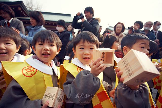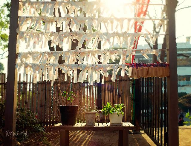 这种系满白纸的木头架子一般会在求签的地方旁边,如果求到了下下签,就把签纸系上来,可以避免灾祸,甭管灵不灵吧反正相当被捧场,我们拜访的每一个求签地点架子上都是满当当的。现在觉得海洋性气候就是好,不管是去年年底来东京,还是现在来,总是有绿色植物在,并且还很水灵。
