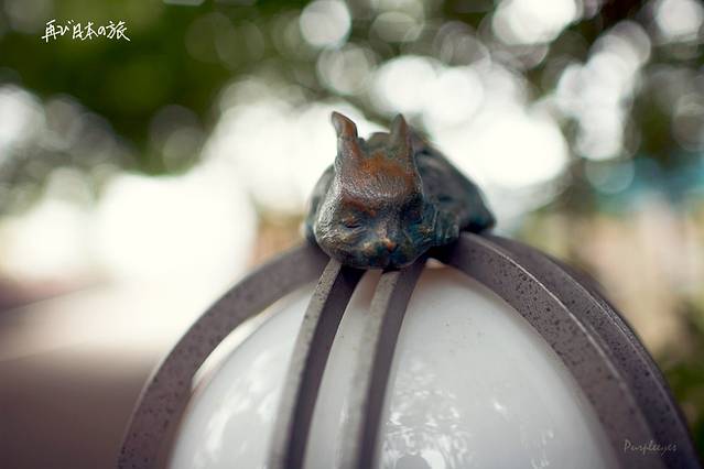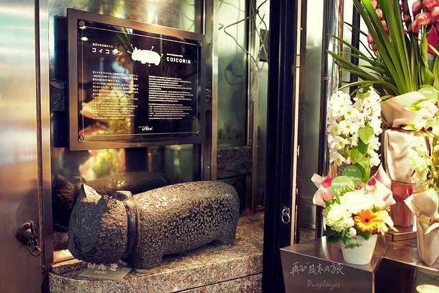 在花店的旁边,还有一只石头做的喵星人,而且居然还拴着,很可爱~