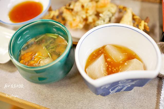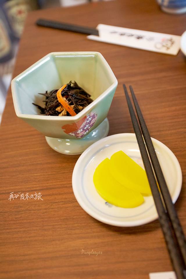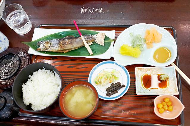把小纸片儿交给服务员之后,一人得到了一杯冰水,又等了一会儿,我们来日本之后的第一顿饭就上来了。套餐是介个样子滴,一菜一饭一汤一小菜,介个是六百点的套餐,忘记叫啥名儿了。。。卖相还不错滴说。