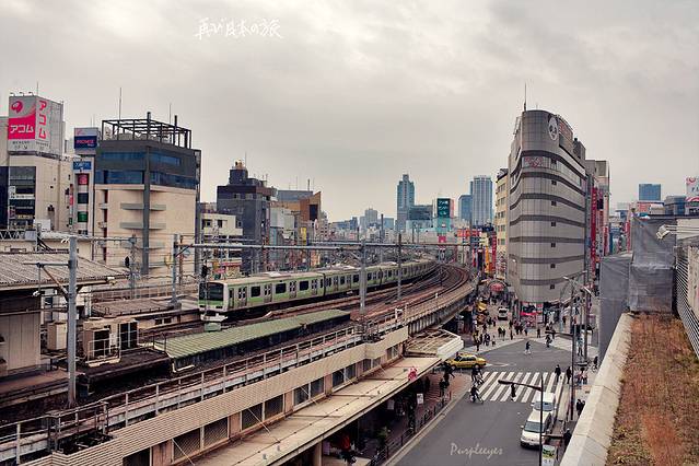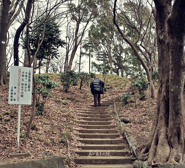 早上的天气真是十分的不喜人,阴嗖嗖的,但我们还是8点半就出门奔赴上野了。到达上野的时候看到云层稍微薄了一些,于是就使劲祈祷一会儿能出个太阳啥的。上野公园这片地方特别逗,到了上野地铁站之后得先走过铁路桥,然后从一个地方上电梯,到了一片高地上,才是公园。这片高地的高度跟铁路线是平行的,大概能有三层楼。于是我拍地铁站的视角就变成了平行的,有意思。