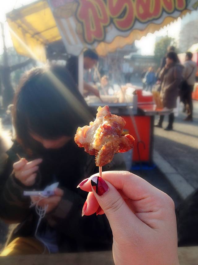这个路边摊集市卖得是各种烤串啊炸物神马的,居然木有章鱼小丸子,想到一会儿还要吃鳗鱼饭,我们又不甘心,就点了一份炸鸡大家分着吃。这会儿还木有流行星星呢,我们也木有配啤酒,不过炸鸡依然好吃哈:)吃的时候木有顾上拍照,所以下面这张是手机照滴,一束神光照耀了未来即将相当火爆滴炸鸡,咩哈哈哈哈!