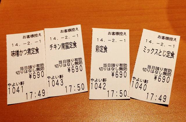 最有趣的是,我们进去后,发现门口摆了一台自助点餐机,原来是需要先点餐+交钱然后再进去找座儿。我们这回可碰着新鲜的了,对着机器和图片儿鼓捣了半天,就搞定了各自的饭,交钱之后就换了这几张纸,这就算是点餐凭据了,嘿嘿。价格么也相当亲民,也就合人民币30多吧。
