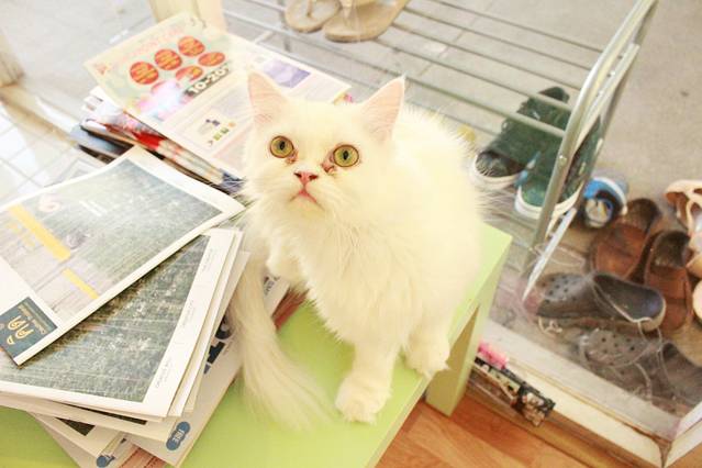眨着大眼看着我~在他身后,还有一个游客稀少的宠物店,透着温暖的黄色灯光。