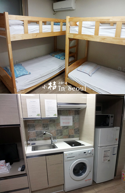 4人间,上下铺,不大,有点像青旅,冰箱、微波炉、洗衣机、电视、卫生间都有,不过卫生间就是一洗澡整间都会湿的大小,有种麻雀虽小五脏俱全的感觉...人均每晚100+人民币的价位,还可以了,交通也还算方便,步行至弘大不远。