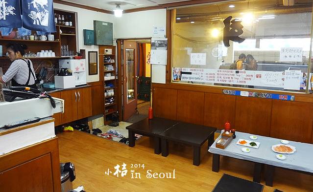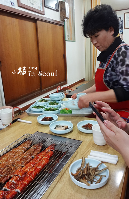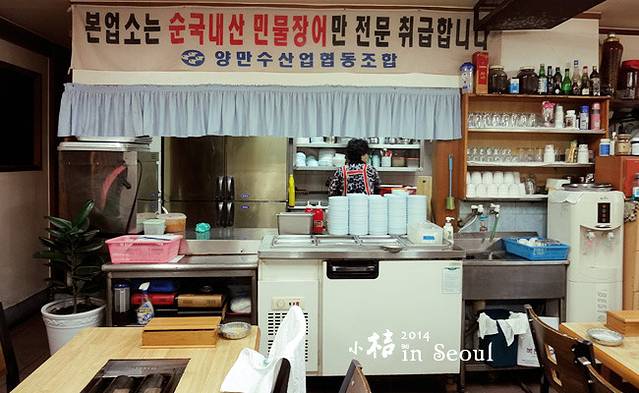 这是夫妻俩经营的家庭式小餐馆,传统韩式风格,清新质朴。 据说韩国的烤鳗主要是用盐或辣椒酱来烤,而这家的主要是用酱油烤,味道接近日式。门口就有几个大鱼缸,里面是活生生的鳗鱼~ 老板娘在厨房里备餐的身影~