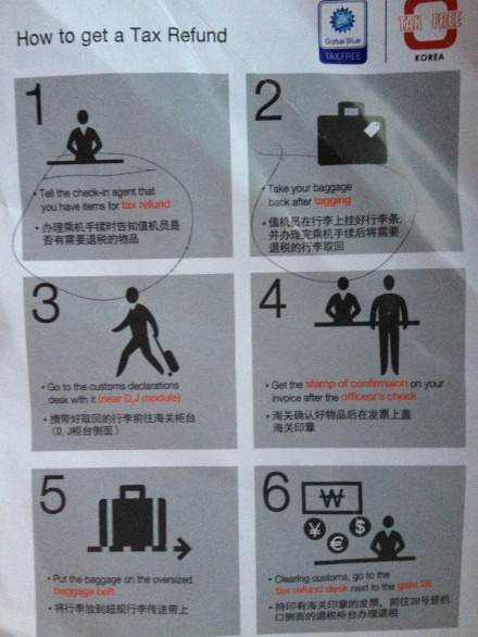 去机场前事先把退税单上的内容填好,退税公司貌似有2个(看买东西的地方给你的是哪家公司的),如多人同行,建议把同一个公司的退税单都填上同一个人的资料,分开排队办理,比较不浪费时间,回头有空再细算。