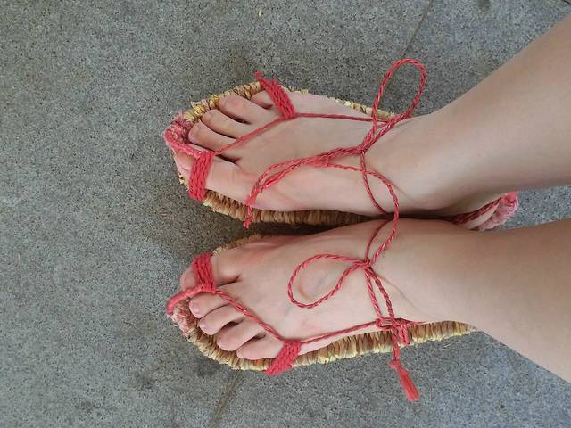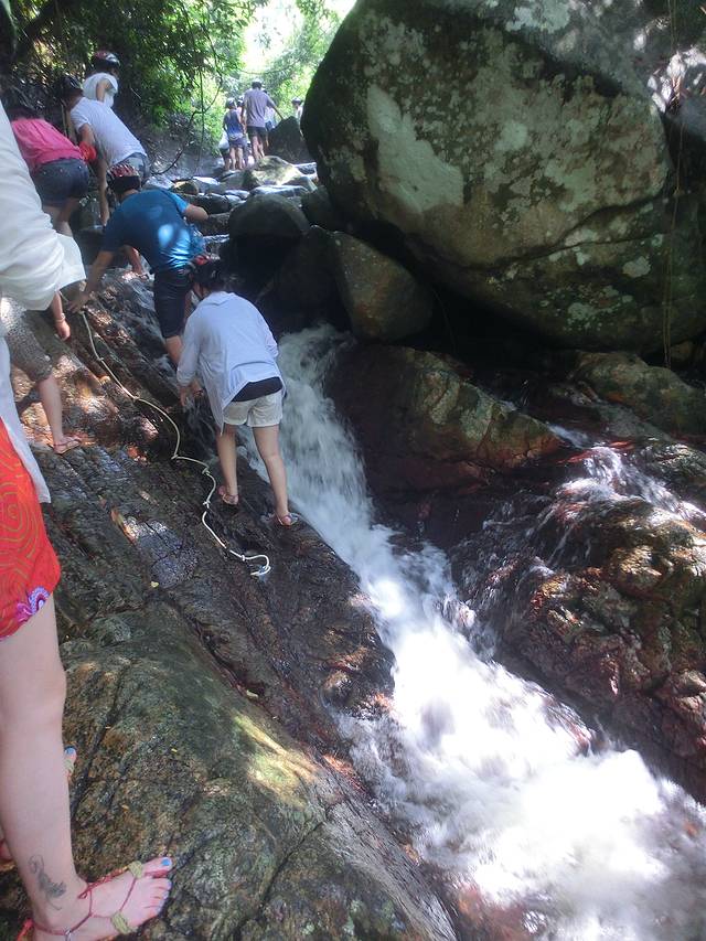 上了山,穿上了每个参加项目的人分发好的草鞋,我开始知道要干嘛了!就是要没交钱的人可以走正常的旅游线路,我们交了钱的就要往水里走,往瀑布里爬!顺带成为走正常线路游人眼里的风景!