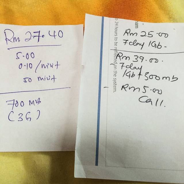 上面的图片是两家分别写给我的。左边是DIGI,27.4马币,其中有5马币的话费和700mb的3G流量。右边是Celcom,25马币,1GB的流量7天之内用,还有一种套餐39马币多了一点流量和5马币的话费。