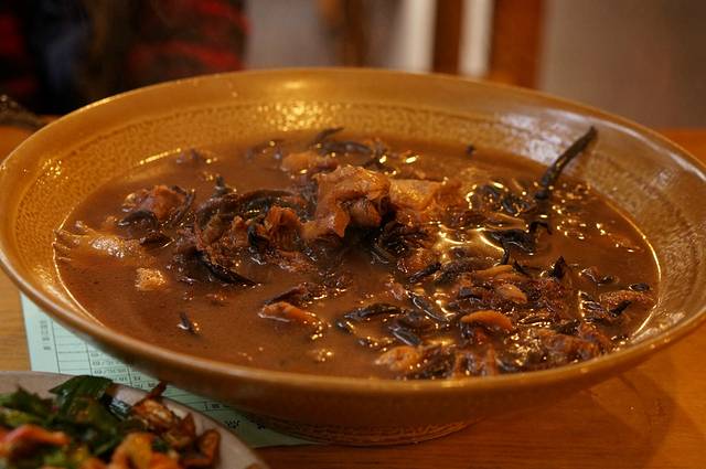 山下的第一顿,两碗小菜一腊排骨一腊香肠一臭豆腐已是小百的价格了!