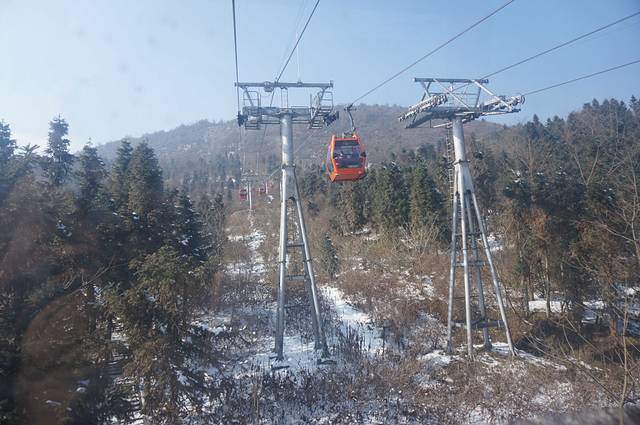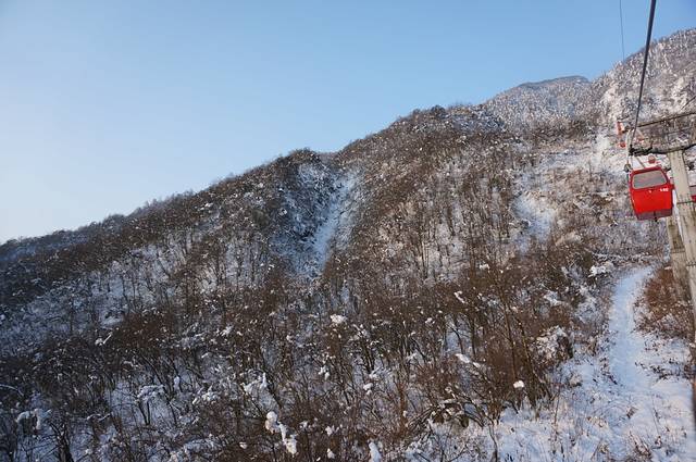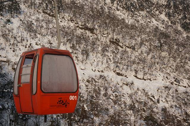 西岭001,哈哈,谁这么幸运坐到拉?太阳刚刚出来,缆车的玻璃上都是冰呢!没有太阳晒到的缆车里,其实还是很阴冷的呢!