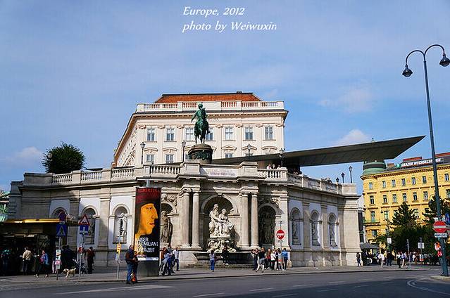回到了清晨进入霍夫堡皇宫前的地方。这张照片中,左边的喷泉,我在前面发过它的正面清晰标准照哦。而右边露出一点点的咖啡馆,则是星巴克。