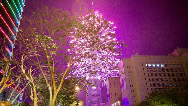 逛完回来已经11点半了,有利地形全都被占了,我们拨开人群只找到这个看烟火的地儿。这棵树也长得太奇葩了。别拦我,我要砍了它!