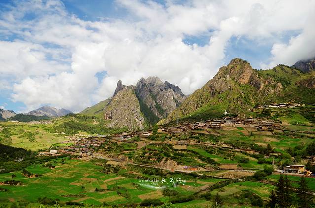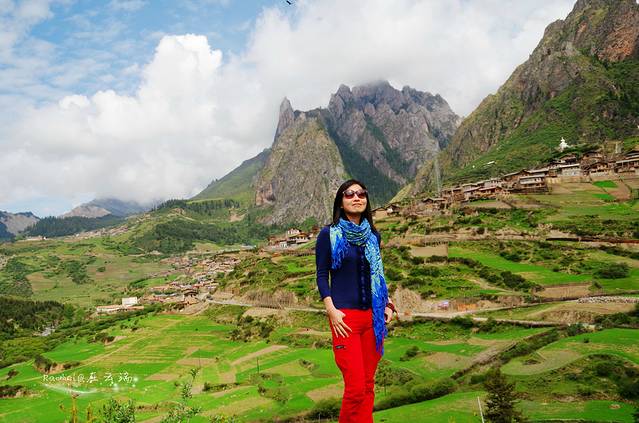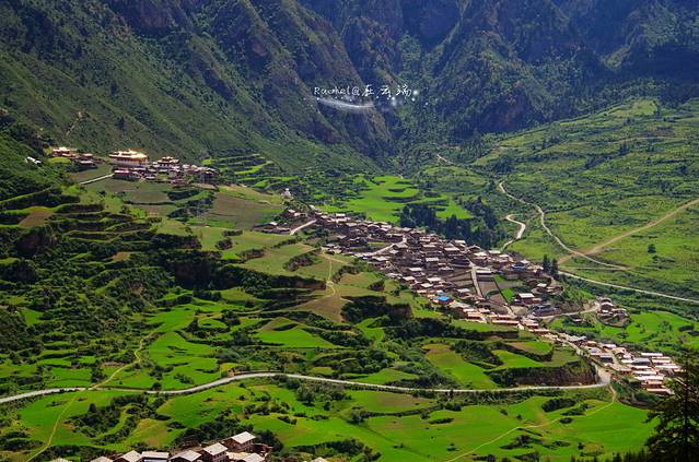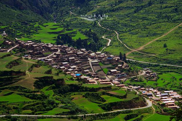 群山脚下宁静的小村庄就是扎尕那了~爬到对面的山坡上,风景尽收眼底,它让我们觉得一路的颠簸和多出的2个小时的行程是那么值得~这里已是甘南的境地了。