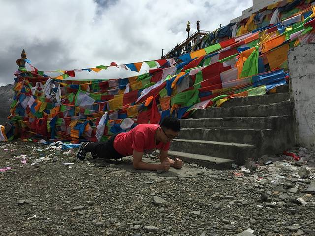 这是折多山口还要往上爬大概有500米的样子。爬上来已经气喘吁吁了,山顶全是经幡。累的已经跳不高了。嘿嘿。