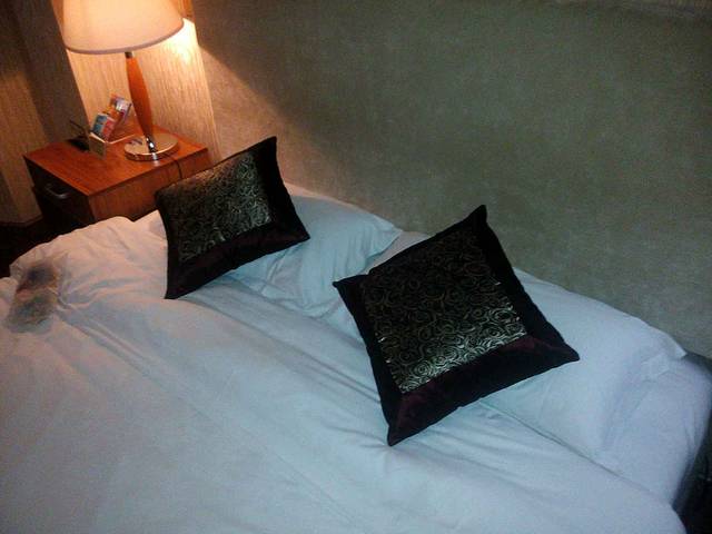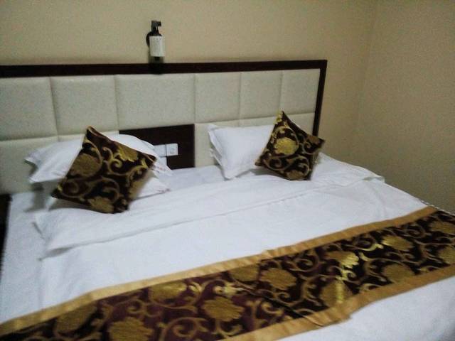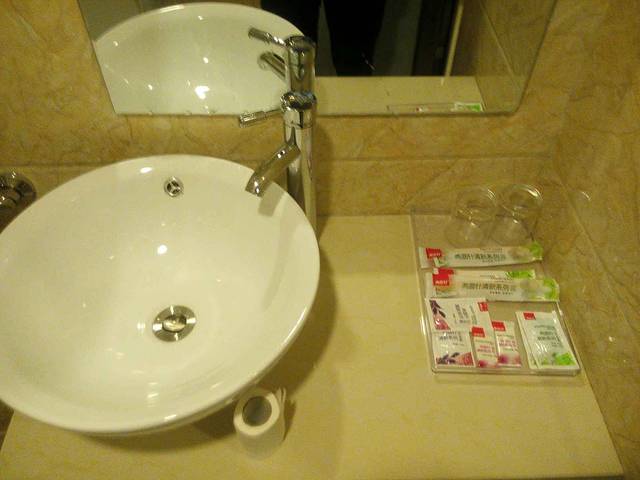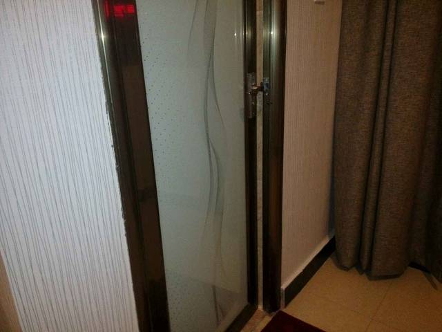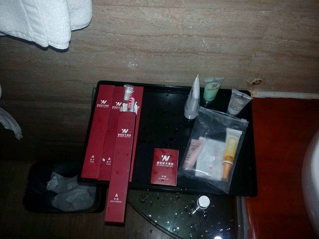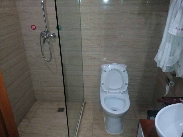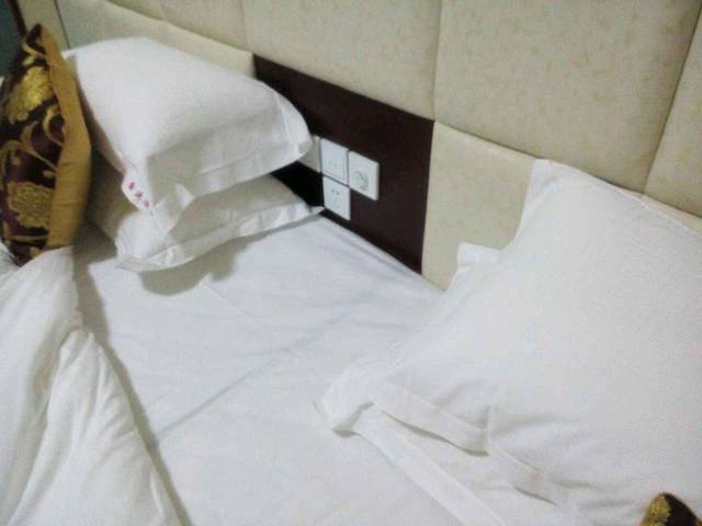酒店2米大床,有四个枕头 客房情况:各个楼层都铺有地毯,客房也铺有地毯,光脚走在地毯上走了能有半个小时,脚还是干净的,这个该点赞。大床房的大床有两米大被子干净没有异味。床上有六个枕头,这点很人性化,妹子们肯定喜欢。床中间有插座和灯的开关,设计人性化,值得表扬。烧热水的时候发现热水壶盖子坏掉,希望酒店能及时更换。要泡茶的时候发现茶杯盖坏了一个,真的希望酒店加强破损物品更换。卫生间采用玻璃隔断,门的位置有间隙,上卫生间时房间有味道。希望改成那种封闭式的。洗漱用品包装很不错,牙刷也很好用。热水很充足,洗了个很爽的热水澡。洗完澡发现没有吹风机。如果冬天的话头发不容易干,希望能配置。