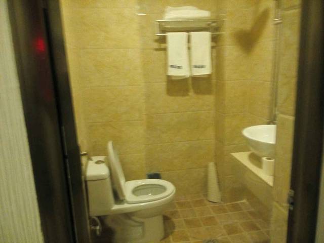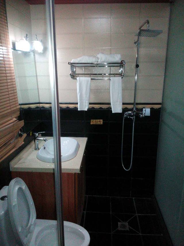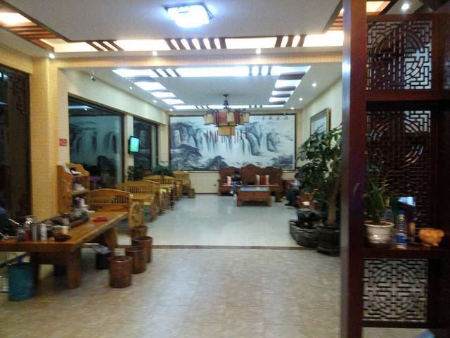 酒店一楼大厅供客人休息的地方 酒店公共区域:酒店的外观很赞,外面可以停很多小车。酒店一楼大厅有个厅可以供客人看电视,看球赛。旁边有个泡茶的地方,想泡茶的话也很方便。一进门右侧的地方是:卖泡面,饮料,和一些纪念品的地方。整个一楼给人感觉很大气。整个酒店分A栋和B栋A栋位于酒店一楼大厅对上,我们就住在A栋4楼603。B栋和吃早餐的地方在A栋的背后。