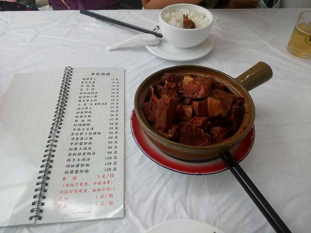 9.15束河古镇午餐粗茶淡饭102rmb,点了牛肉土豆煲58rmb,酸菜炒小笋28rmb,米饭3rmb/人。牛肉土豆煲很下饭,牛肉大块,土豆喷香,汤汁拌饭也很美味,酸菜小笋清淡酸爽,值得品尝……