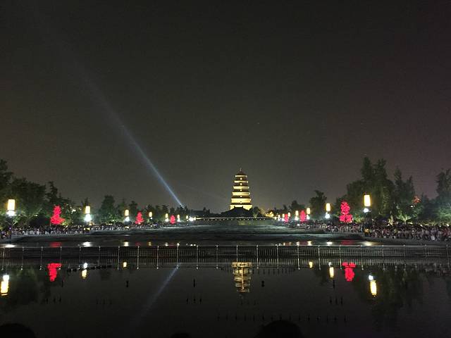 大雁塔音乐喷泉号称亚洲最大的音乐喷泉,每晚九点到九点半为音乐喷泉表演时间。还好在九点前赶到不过这阵势,这是要看升国旗吗!里三层外三层的。