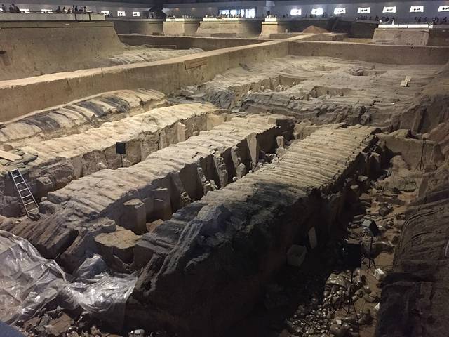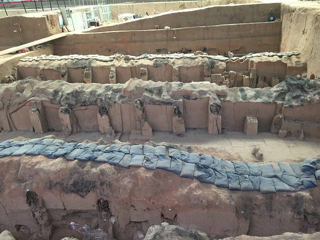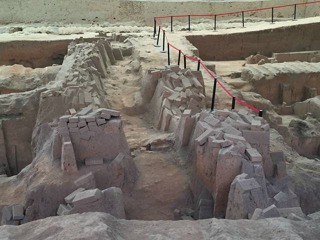 发掘现场:兵马俑一直采用边发掘边展览的方法。虽然兵马俑享誉国际,但是也面临着一个重大的难题,兵马俑是有能力发掘没能力保护。挖掘出来的兵马俑无法保存原来本色。这也是给考古界一个挑战的难题。
