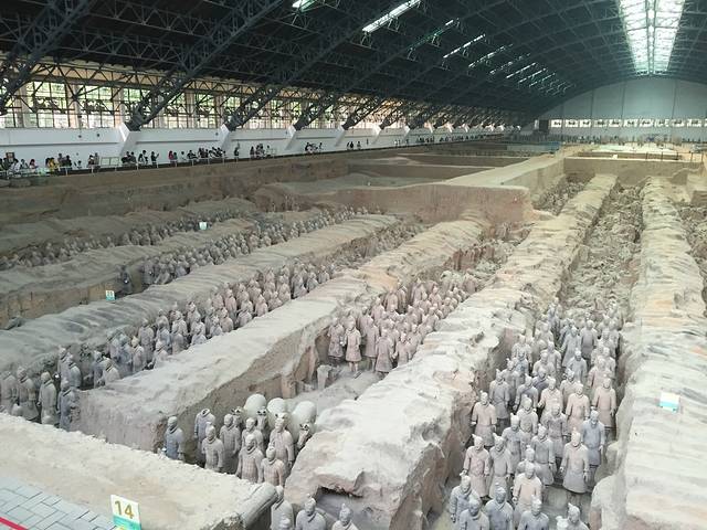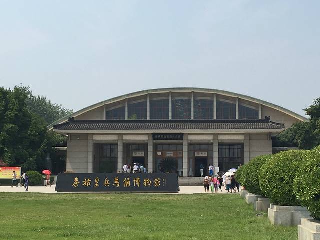 到售票厅拿票(提前网上团的,便宜15元)检票后迎面就是兵马俑的一号展览厅。仿秦时建筑风格,简约而不失大气,门上的牌匾用小篆字体,更突出秦朝风格。我们跟随着旅游的人流步入期待已久的兵马俑展厅。