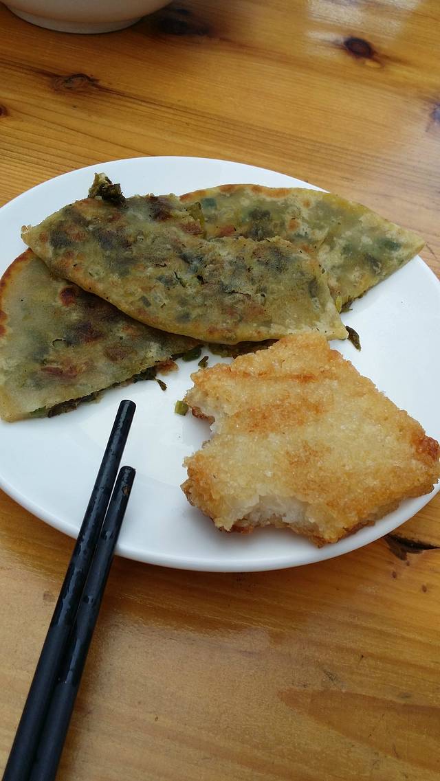 糯米的,具体叫什么不记得了,炸的金黄,味道很好吃,另一个是雪菜馅饼~