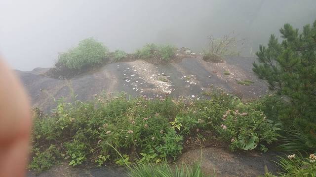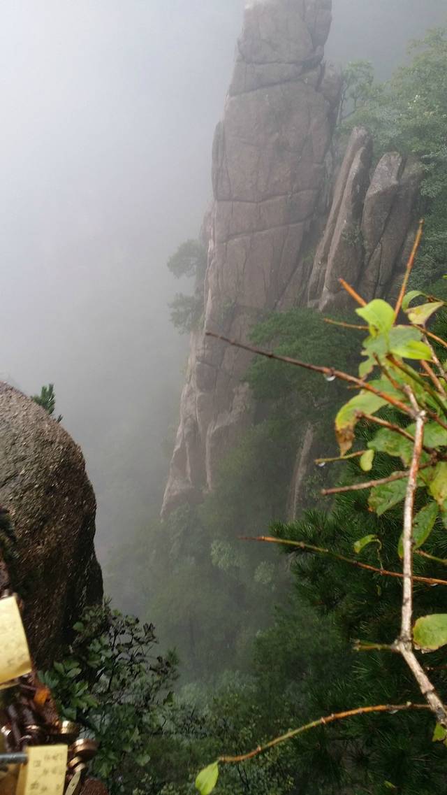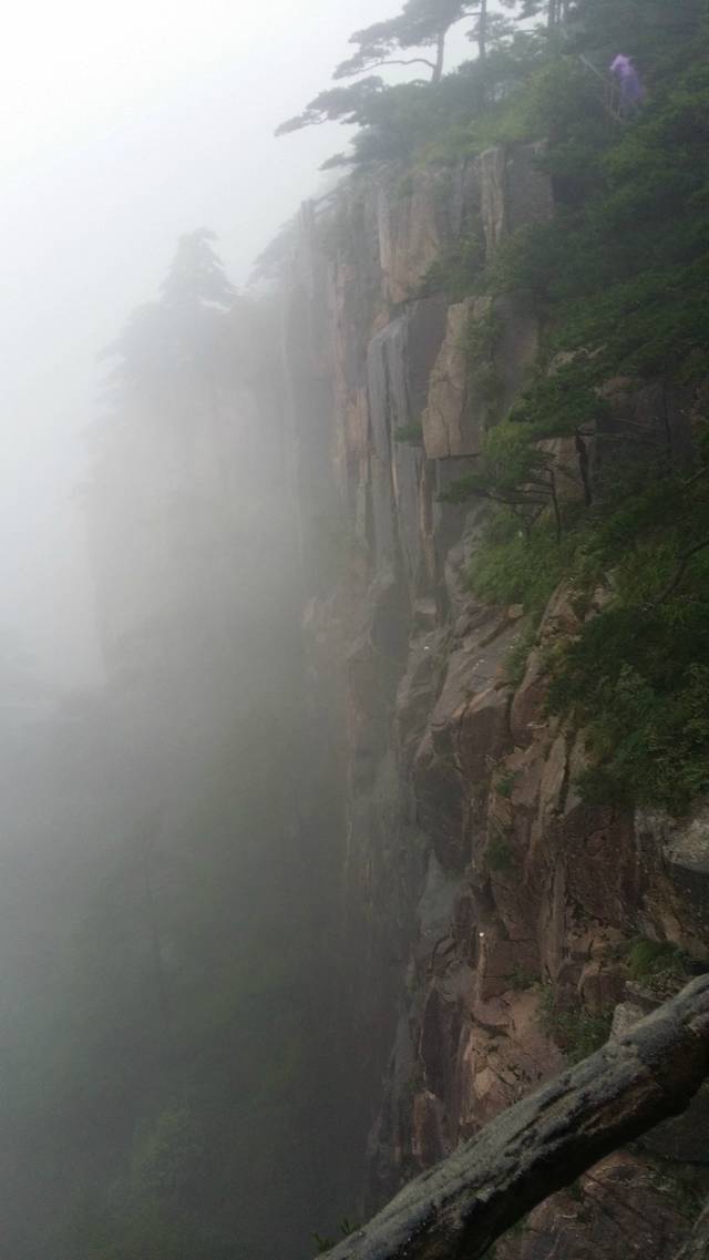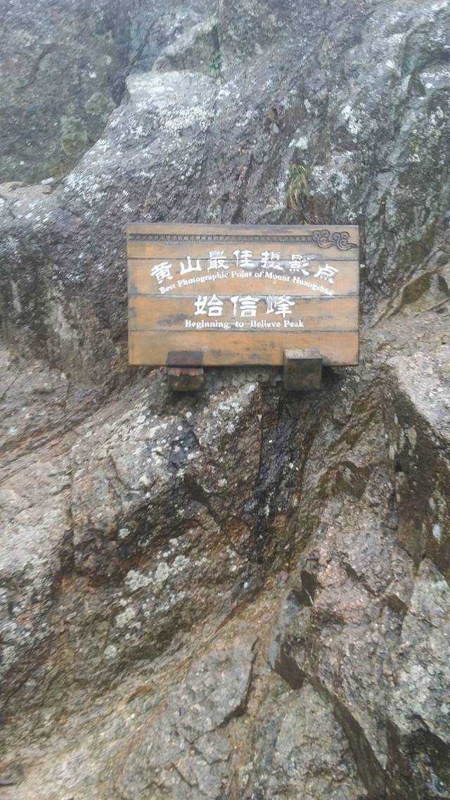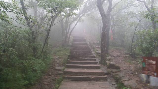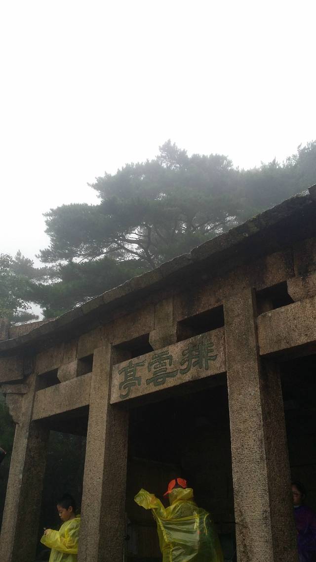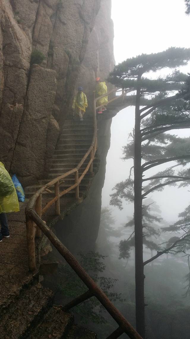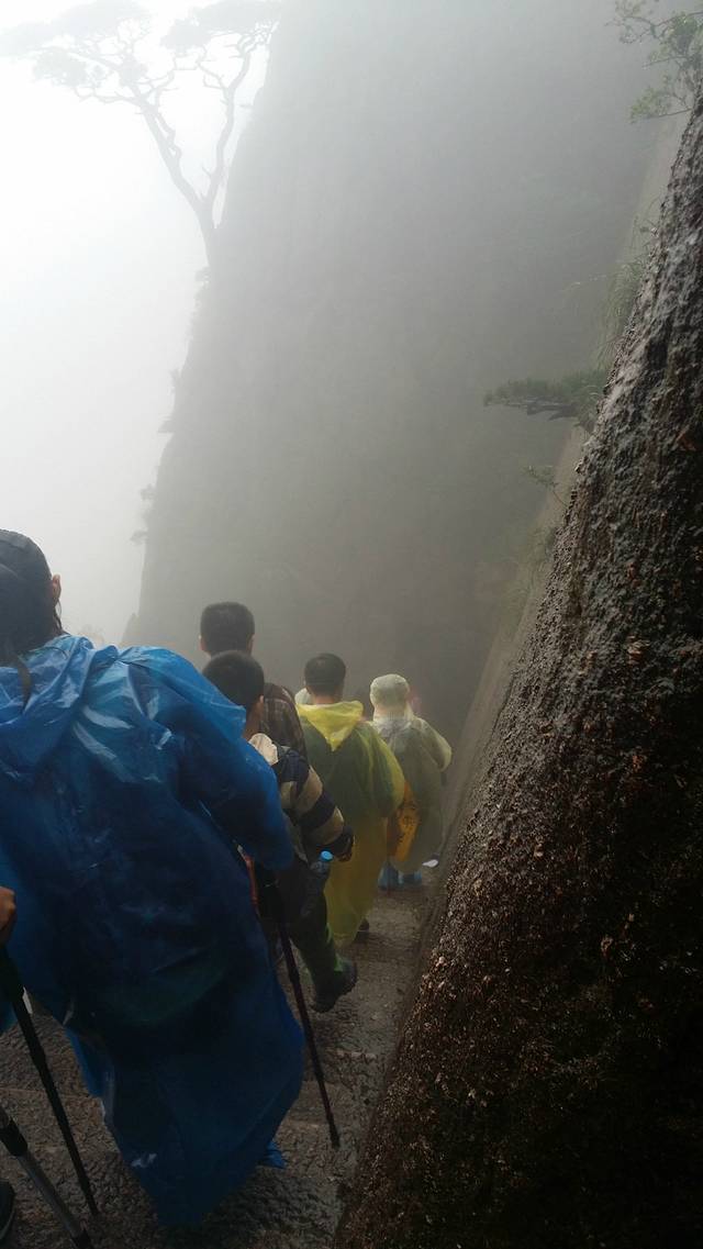 伴着蒙蒙细雨,开始了我们的登山。幸好准备了雨衣,从缆车下来之后,立刻换上了,7:30登山开始。第一个目标,始信峰。
