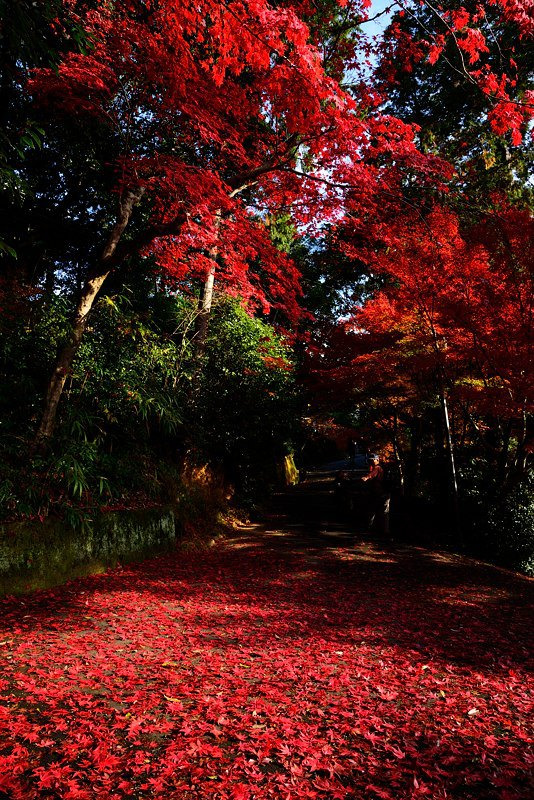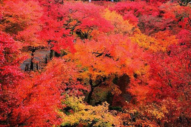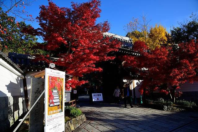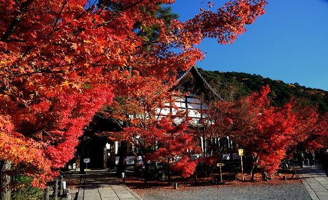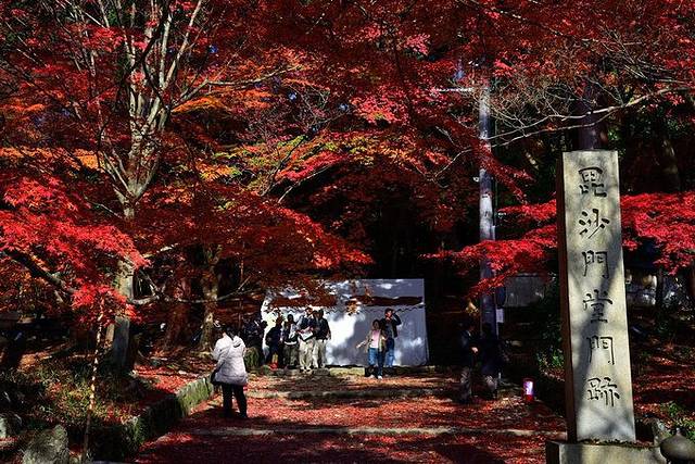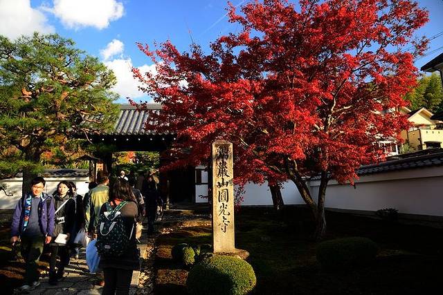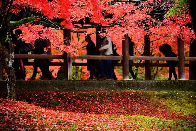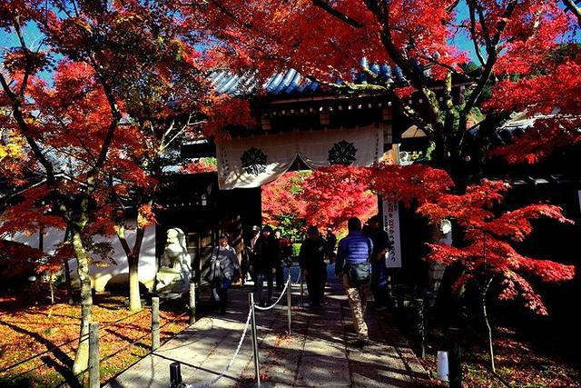 永观堂的枫叶真是红的极其浓艳,京都的其他寺庙恐怕都无出其右者。还未进入寺内,远远便能看到似火的红叶争俏似的极力伸出白墙之外。游客此时即使不知永观堂的威名,多半也会被此景吸引而入内参观吧。