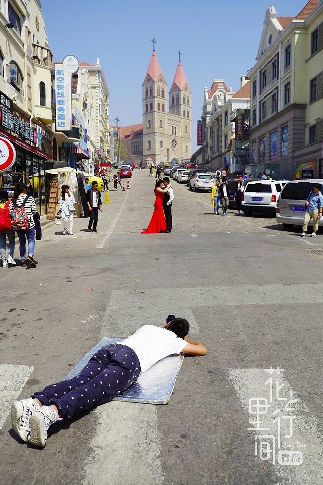 不过是早上八点多,天主教堂已经成为了一片白色的海洋(好多对新人在拍婚纱照)。早就听闻青岛的婚纱摄影场景非常壮观,但真的身临其境才能感受到那个强大的存在。