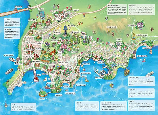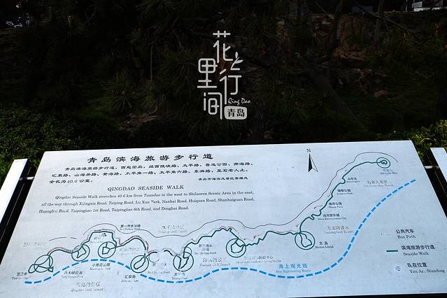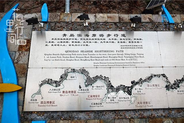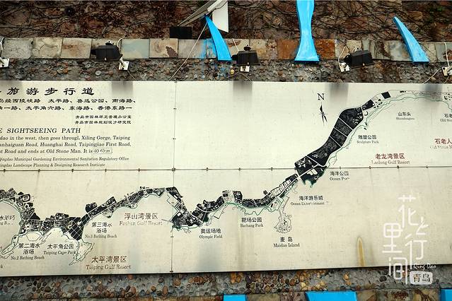 青岛有一条很长的滨海栈道。全道为木板栈道,沿海而建,西起团岛环路,东至石老人公园,栈道依山傍海,观景听风,极为舒畅。下面就是这条栈道的游览图